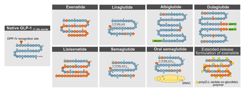 不同药物提高半衰期的策略(来源:Recent Advances in Incretin-Based Pharmacotherapies for theTreatment of Obesity and Diabetes)