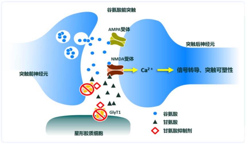 甘氨酸是中枢神经系统中重要的神经递质,在抑制性突触中能通过激活甘氨酸受体控制呼吸节律、肌张力等并参与早期发育,在兴奋性突触中作为共激动剂参与N-甲基-D-天冬氨酸型谷氨酸受体(NMDARs)激活调控学习与记忆活动的进程。突触间隙甘氨酸浓度由GlyT1和GlyT2调控以平衡突触前后活动,抑制性神经元突触间隙甘氨酸主要由GlyT2回收,兴奋性神经元突触间隙中NMDAR附近的甘氨酸浓度主要由GlyT1调节。目前的研究认为NMDA R的功能减退是精神分裂症的致病机制之一,而GlyT1与NMDAR高度共定位,抑制GlyT1可提高甘氨酸浓度促进NMDAR激活,所以GlyT1成为了治疗精神分裂症的关键靶点。