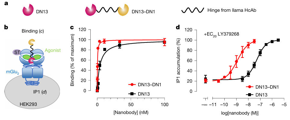 此前,团队已研发出纳米抗体DN13,它可特异性结合mGlu2受体并对其进行正向调节,具备靶向mGlu2的基础优势。为进一步提升其效能和脑部作用潜力,研究团队创新性地将DN13与另一个结合mGlu2但不激活它的纳米抗体DN1,通过特殊的连接子(Linker)连接起来,构建了双价双特异性纳米抗体DN13-DN1。
