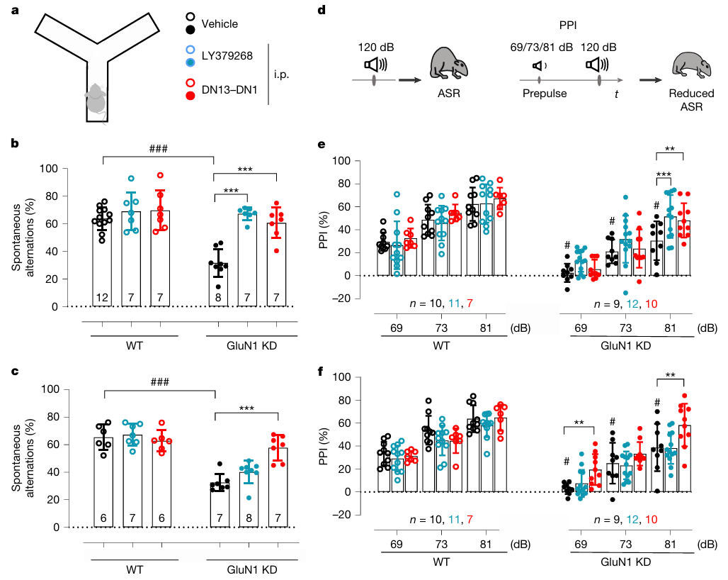 该模型通过降低GluN1亚基表达,导致NMDA受体功能部分缺失,模拟人类罕见病GRIN1障碍。团队采用Y迷宫测试评估工作记忆,前脉冲抑制(PPI)测试评估感觉运动门控。Y迷宫测试结果显示:单次腹腔注射20mg/kg DN13-DN1,3小时后GluN1-KD小鼠的工作记忆显著提升,与LY379268效果相当;7天后再次测试,DN13-DN1组仍维持改善效果,LY379268组则无明显作用。