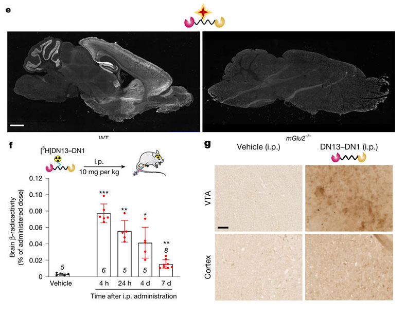免疫组化结果进一步证实,给药24小时后,DN13-DN1在腹侧被盖区(VTA)、大脑皮层等mGlu2高表达区域特异性分布,而对照组(生理盐水注射)无阳性信号。放射自显影实验也观察到类似的脑区分布特征,明确证明DN13-DN1可穿透血脑屏障并在脑内特定区域富集留存。