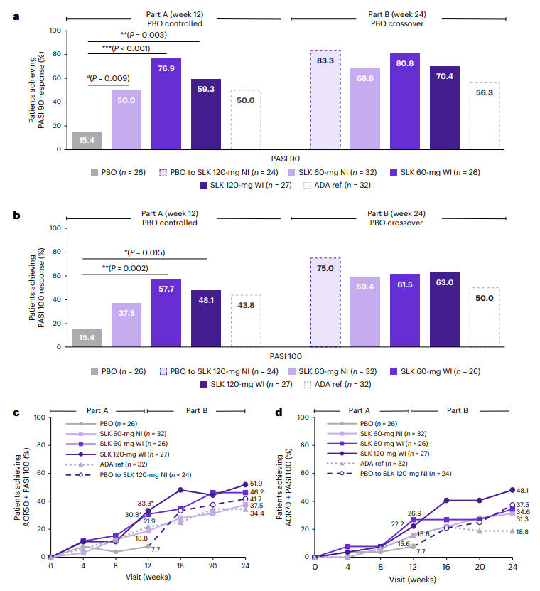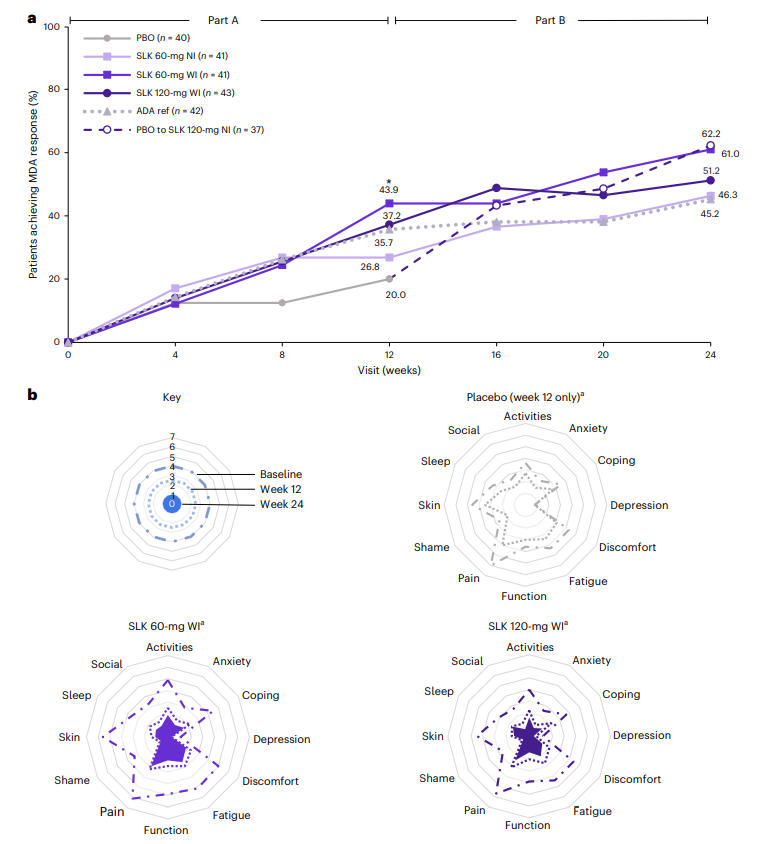 在关节症状改善方面,治疗第12周时,Sonelokimab 60 mg WI组与120 mg WI组的ACR50应答率分别达到46.3%和46.5%,显著高于安慰剂组的20%(P<0.05, P<0.01);60 mg NI组为36.6%,与安慰剂组的差异未达统计学显著性(P=0.086)。疗效持续至第24周时,Sonelokimab各剂量组的ACR50应答率进一步提升至58.1%~61.0%。此外,从第12周由安慰剂切换至SLK 120 mg NI治疗的患者,其ACR50应答率在第24周时升至54.1%,而阿达木单抗组为54.8%,充分体现了Sonelokimab对关节炎症的持续控制作用。