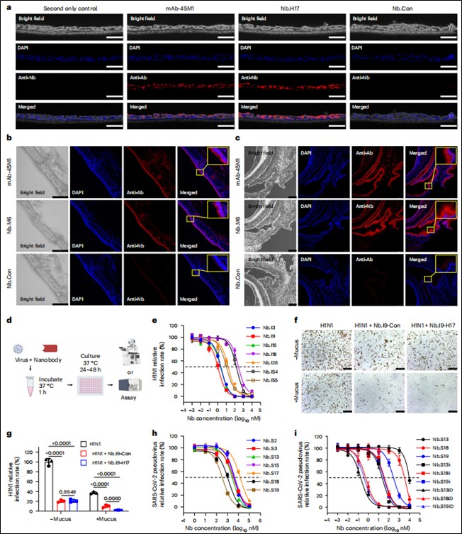 Nanpbody Binding and Neutralization Validation: Immunofluorescence and Western blot confirmed nanobody binding to targets (mucus/viral proteins). Live virus neutralization assays (H1N1/MDCK cells) and pseudovirus neutralization assays (SARS-CoV-2/hACE2-293T cells) evaluated neutralizing efficacy (Figure 2d, e, h, i).