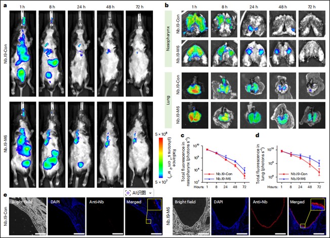 Pharmacokinetic Study: Fluorescently labeled nanobodies were administered intranasally to mice. In vivo/ex vivo optical imaging and immunofluorescence staining compared the retention time of tethered vs. non-tethered nanobodies in the respiratory tract (nasopharynx, lungs).