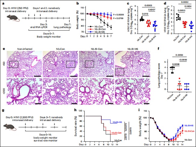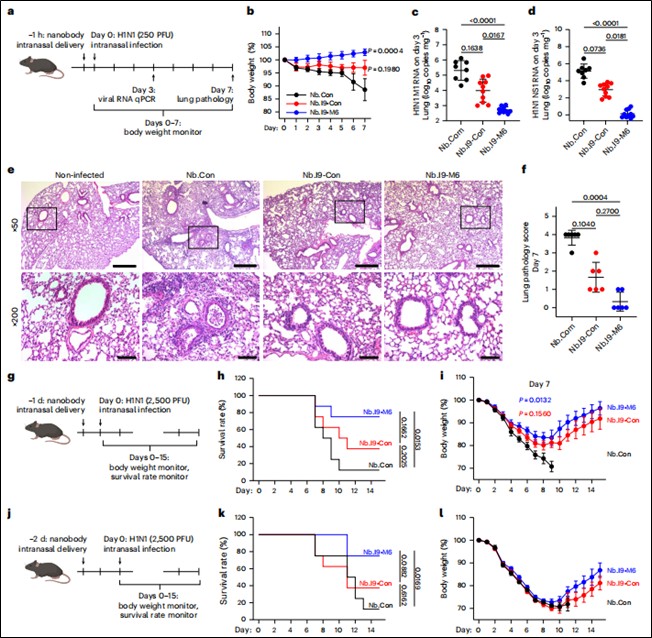 Prevention Model: Nanobodies were administered intranasally at different time points (1h, 24h, 48h) before challenge with low-dose (250 PFU) or high-dose (2500 PFU) H1N1 virus. Body weight changes, survival rates, lung viral loads (qPCR for M1/NS1 genes), and pathological damage were monitored (Figure 4).