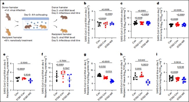 Cohabitation Transmission Model: "Donor" hamsters were first infected, then co-housed with "recipient" hamsters pre-treated with nanobodies for a specified duration. Recipient hamsters were monitored for body weight, viral RNA loads, and infectious viral titers in the upper/lower respiratory tract (oral swabs, nasal turbinates, lungs) to assess transmission-blocking efficacy (Figure 6).
