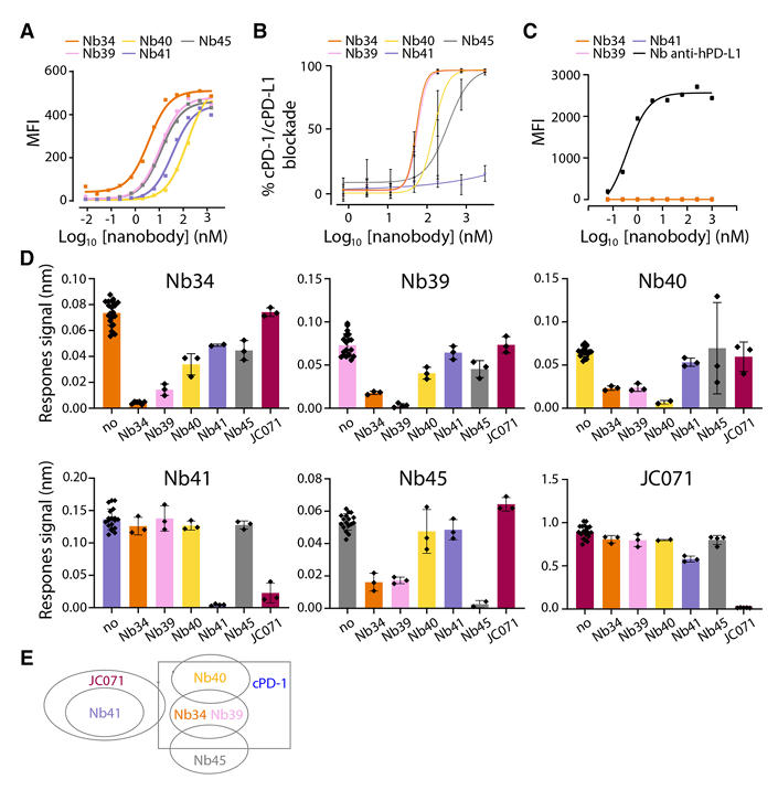 为明确纳米抗体在cPD-L1上的表位分布,研究团队通过BLI进行表位分箱实验。结果显示,Nb34和Nb39结合位点相近,对Nb40和Nb45的结合有一定阻碍,而Nb40和Nb45结合于非重叠表位。令人意外的是,已知能阻断cPD-1/cPD-L1相互作用的单克隆抗体JC071,仅与无法阻断该相互作用的Nb41竞争结合位点,推测JC071的阻断作用可能依赖空间位阻而非直接竞争PD-1结合表位。