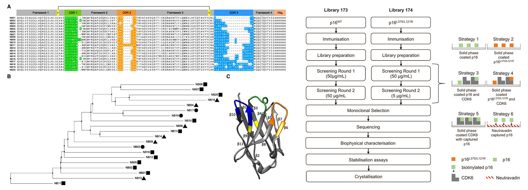 为实现这一目标,研究团队首先从构建高亲和力的抗p16纳米抗体库入手。研究人员优化了p16蛋白的表达与纯化,通过添加Avi标签及引入稳定性突变(W15D、L37S、L121R),显著提升了p16蛋白的产量与均一性。随后用野生型p16和双突变体p16L37S/L121R分别免疫羊驼,构建了两个噬菌体展示纳米抗体库(Library173和174),库容分别达4.2*1013和6.2*1013。而后采用六种生物淘选策略,包括固相包被p16、p16-CDK6复合物捕获及链霉亲和素捕获生物素化p16等,在经过两轮筛选后,从Library 174中观察到更为显著的富集效果,随后从两个文库的各个策略中均筛选出了独特的阳性克隆。通过CDR3序列比对,将阳性克隆分为6个主要家族(占比超60%)和16个小家族,随机选取20个代表性克隆进行后续分析,其中19个实现高效表达,系统发育树分析显示这些抗体具有不同的结合表位。