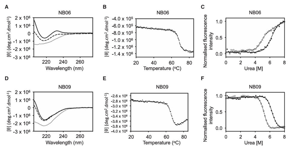 通过远紫外圆二色谱(far-UV CD)分析,所有纳米抗体均呈现典型的反平行β折叠结构,特征吸收峰位于218 nm,表明其结构完整。热稳定性测试显示,多数纳米抗体的解折叠中点温度(Tm)介于60-80℃,其中NB06为68.3℃,NB09为66.6℃,且部分纳米抗体(如NB04、NB07)具有良好的复折叠能力。