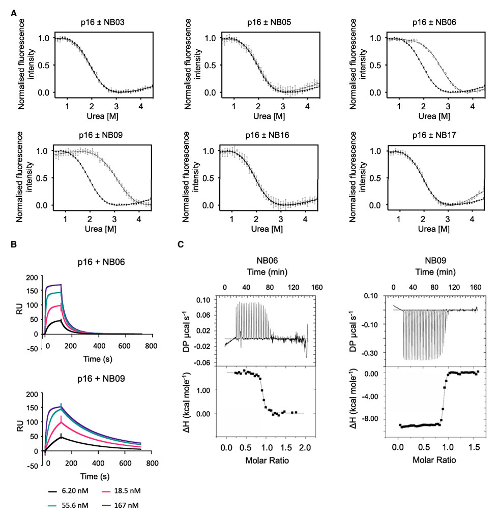 尿素变性实验显示,野生型p16的D50%为1.94 M,而NB06和NB09可使其分别提升至2.80 M和3.11 M,自由能(ΔGunf)从3.22 kcal/mol分别增至4.65和5.16 kcal/mol,其他四种纳米抗体则无显著稳定作用。表面等离子体共振(SPR)和等温滴定量热法(ITC)证实,NB09(KD=7.52 nM)对p16的亲和力高于NB06(KD=19.98 nM),且二者结合模式不同(NB06结合为吸热反应,NB09为放热反应)。