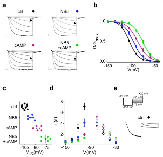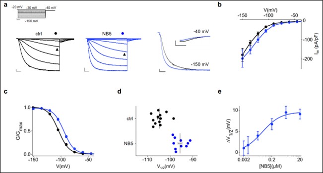 NB5使HCN4通道的电压依赖性激活曲线向去极化方向(右移)约9-10 mV。这种右移导致在生理相关的膜电位范围内,通道开放概率增加,起搏电流增强。其效应与内源性激动剂cAMP可叠加,说明两者通过相互独立的路径发挥作用(见图2)。