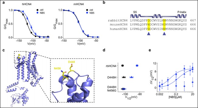 突变验证:将兔HCN4的D448和/或N456突变为小鼠对应的氨基酸,会显著削弱或完全消除NB5的激活效应;反之,将小鼠HCN4的对应位点突变为人/兔的氨基酸,则能赋予其对NB5的部分敏感性。