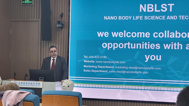 本次会议由法国CIPREVO生物科技公司总裁Grégoire Prévost主持并为会议拉开帷幕。12月6日下午,由武汉纳博生命科技有限公司市场总监Ali H.D. Wari介绍了纳米抗体的研究及市场现状,对与会人员表示欢迎与感谢并宣布议程进入“感知生物与纳米抗体”环节。