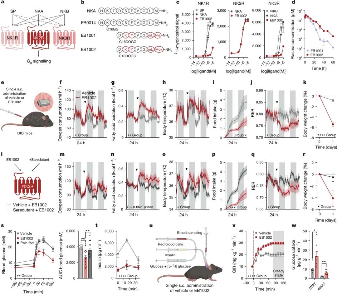 在研究中,科研人员对肥胖模型小鼠注射了一种NK2R的天然配体激动剂后发现这些肥胖小鼠体重在短期明显下降,分析结果表明小鼠的能量消耗显著增加,食物摄入下降约20%,且该代谢效应并不依赖于瘦素(Leptin)信号通路。此外,科研人员发现优化后的NK2R激动剂EB1002不仅使小鼠在单次注射后的7天内体重持续下降约15%,还能提高小鼠对胰岛素的敏感性,促进白色脂肪组织摄取葡萄糖,且能激活下丘脑弓状核和室旁核神经元来抑制因瘦素或黑皮质素4受体缺失引起的高食欲状态。这个结果表明该靶点可能在抗肥胖领域中,远比合并糖尿病的肥胖具有更广泛的应用前景。