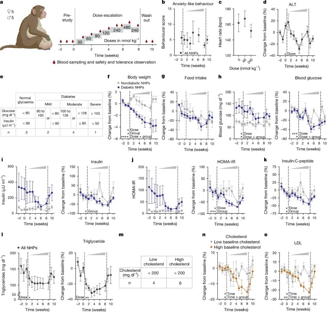 在后续针对糖尿病的研究中,科研人员对2型糖尿病和肥胖的猕猴模型进行了深入研究。结果表明,NK2R激动剂可显著降低猕猴体重约8%、血糖降低约15%、甘油三酯降低约25%、胆固醇降低约20%。该数据证明通过激活NK2R能够显著提升胰岛素敏感性、降低血糖水平以及减少甘油三酯和胆固醇的含量,改善胰岛素抵抗。在为期12周的研究中,猕猴未引起明显不良行为变化或中枢神经系统副作用[2]。