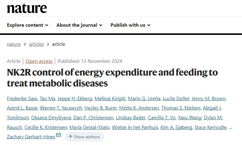 [2] Sass F, Ma T, Ekberg JH, Kirigiti M, Ureña MG, Dollet L, Brown JM, Basse AL, Yacawych WT, Burm HB, Andersen MK, Nielsen TS, Tomlinson AJ, Dmytiyeva O, Christensen DP, Bader L, Vo CT, Wang Y, Rausch DM, Kristensen CK, Gestal-Mato M, In Het Panhuis W, Sjøberg KA, Kernodle S, Petersen JE, Pavlovskyi A, Sandhu M, Moltke I, Jørgensen ME, Albrechtsen A, Grarup N, Babu MM, Rensen PCN, Kooijman S, Seeley RJ, Worthmann A, Heeren J, Pers TH, Hansen T, Gustafsson MBF, Tang-Christensen M, Kilpeläinen TO, Myers MG Jr, Kievit P, Schwartz TW, Hansen JB, Gerhart-Hines Z. NK2R control of energy expenditure and feeding to treat metabolic diseases. Nature. 2024 Nov 13. doi: 10.1038/s41586-024-08207-0. Epub ahead of print. PMID: 39537932.