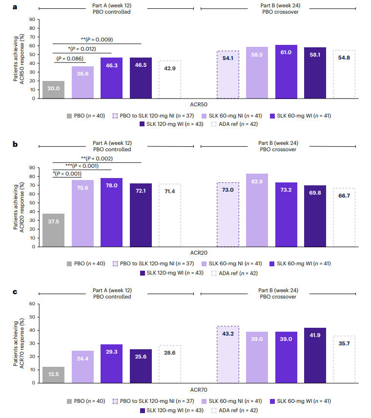 在关节症状改善方面,治疗第12周时,Sonelokimab 60 mg WI组与120 mg WI组的ACR50应答率分别达到46.3%和46.5%,显著高于安慰剂组的20%(P<0.05, P<0.01);60 mg NI组为36.6%,与安慰剂组的差异未达统计学显著性(P=0.086)。疗效持续至第24周时,Sonelokimab各剂量组的ACR50应答率进一步提升至58.1%~61.0%。此外,从第12周由安慰剂切换至SLK 120 mg NI治疗的患者,其ACR50应答率在第24周时升至54.1%,而阿达木单抗组为54.8%,充分体现了Sonelokimab对关节炎症的持续控制作用。