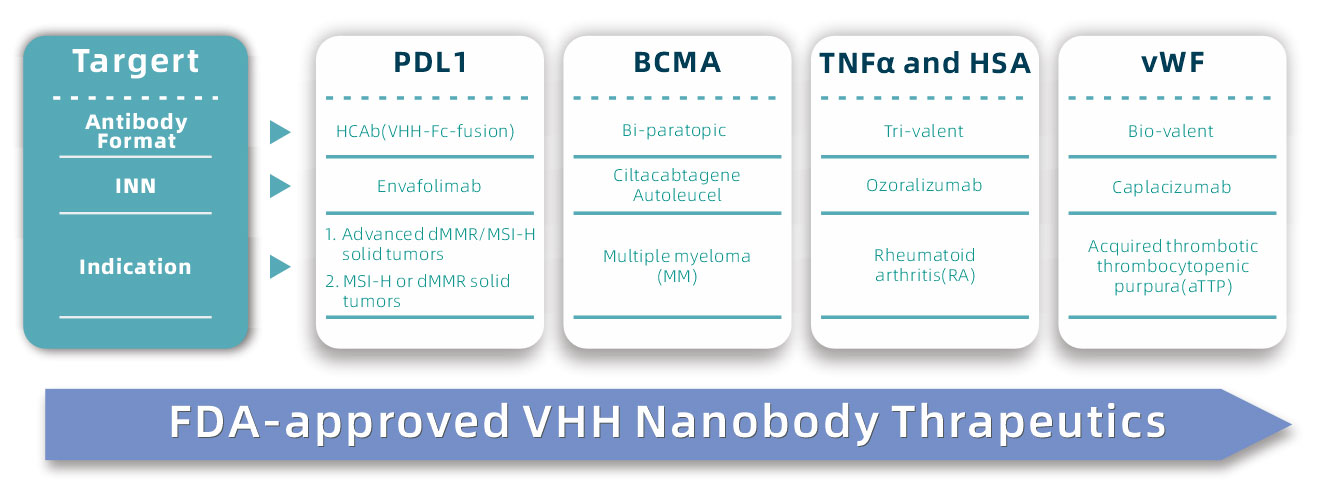 仅仅29年后,**纳米抗体药物Caplacizumab就获得了FDA批准,用于治疗自身免疫性血小板减少性紫癜获得性血栓性血小板减少性紫癜(acquired thrombotic thrombocytopenic purpura, aTTP)。此后纳米抗体相关的抗体药物的研发进入了快车道,截至2025年,共有4款纳米抗体药物获批上市,充分展示了纳米抗体在抗体药物领域的卓越性质。如今,纳米抗体更是在ADC、TCE、in vivo CAR、RDC等多个领域,以不同的抗体构型,得到广泛应用。