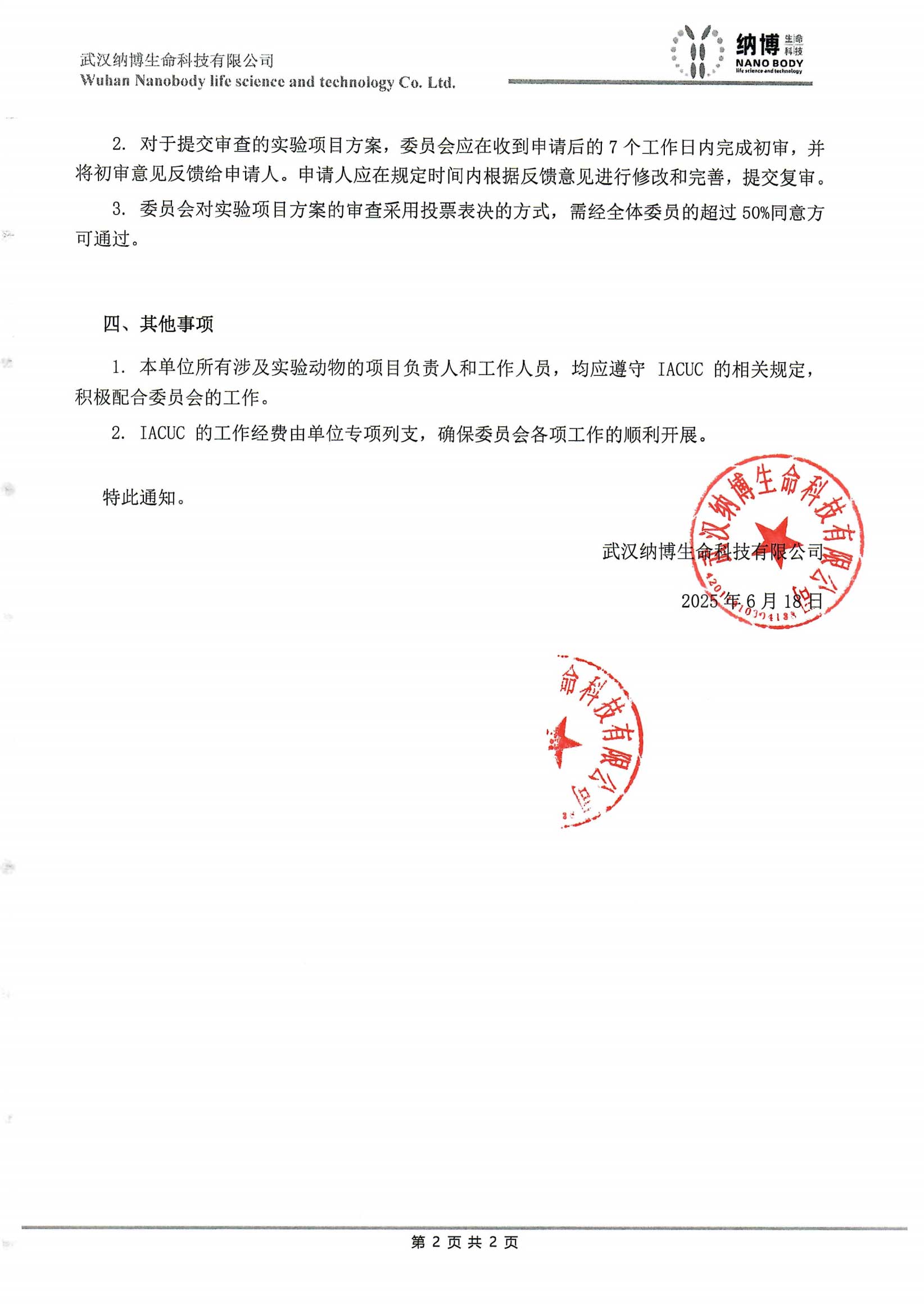为了加强本单位实验动物的管理与使用,确保实验动物的福利和伦理规范得到有效落实,依据相关法律法规和政策要求,经研究决定,成立武汉纳博生命科技有限实验动物管理与使用委员会(Institutional Animal Care and Use Committee,简称 IACUC)。现将有关事项通知如下: