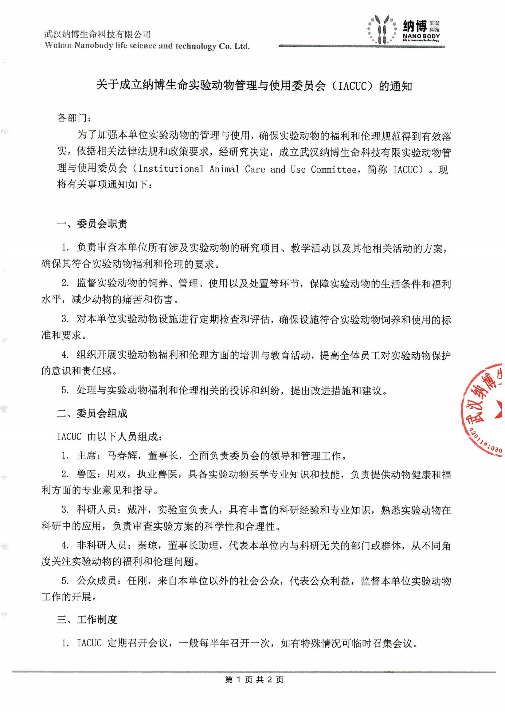 各部门:        为了加强本单位实验动物的管理与使用,确保实验动物的福利和伦理规范得到有效落实,依据相关法律法规和政策要求,经研究决定,成立武汉纳博生命科技有限实验动物管理与使用委员会(Institutional Animal Care and Use Committee,简称 IACUC)。现将有关事项通知如下:        ...