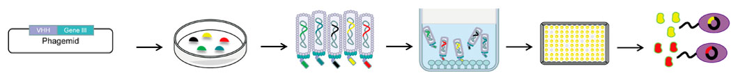 噬菌体展示技术迄今已经有60年的历史,是最早应用于抗体筛选的展示技术。噬菌体展示是通过将待改造的抗体或其他类型的蛋白构建在病毒表面蛋白上来实现的,如pIII、pVIII、pVII、pVI以及pIX蛋白。其中最常用的是pVIII,因为该蛋白在噬菌体表面有大约3000个拷贝,可以大大增强检测信号。噬菌体展示技术最大的优势是库容量大,可以达到1E10-1E11级别,能够轻易地满足免疫库或突变库的库容需求,有利于抗体的筛选。依托大肠杆菌原核表达体系,噬菌体展示技术虽然无法在抗体成药性和序列特异性方面同哺乳动物细胞展示技术相比,但凭借相对简单的实验操作步骤,更短的技术周期,自问世以来即成为问世以来经久不衰的筛选技术。纳博生命科技的NabLib®抗体发现平台提供高效的噬菌体展示为基础的抗体发现及抗体工程服务,助力抗体药物开发。