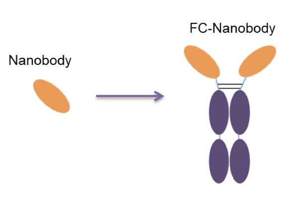 由于有些标记分子比较大,存在空间位阻等因素,标记之后会很大程度上影响抗体的亲和力。为了解决这个问题,可以再纳米抗体上加上FC片段,来改造纳米抗体,并且FC可根据实验需求选择human-FC、mouse-FC、rabbit-FC等,来满足不同实验需求。