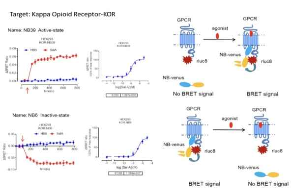 纳米抗体可以基于BRET方法,实时检测受体活性状态。根据相关文章记载,构建相对应的功能质粒,并做检测,得到的结果和文章中一致,基于BRET技术,纳米抗体可以实时检测受体的活性状态。